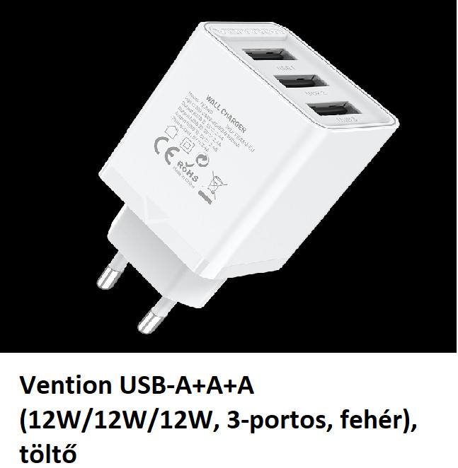 Vention USB-A+A+A (12W/12W/12W, 3-portos, fehér), töltő